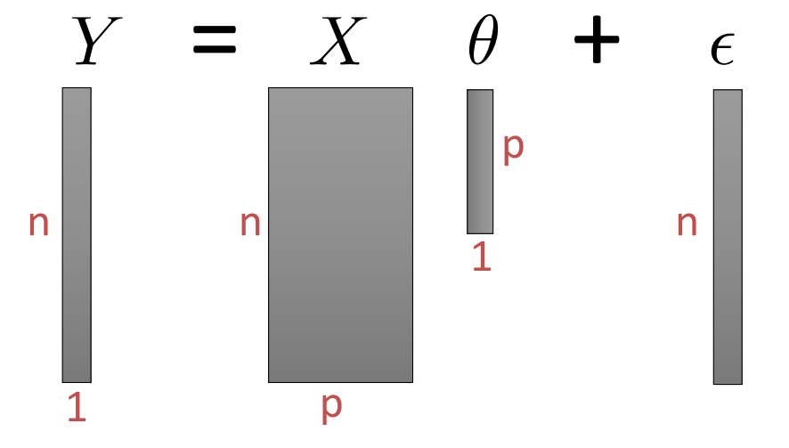 이런식으로 구성이 된다. 위 식과 다르게 row의 개수는 data의 개수가 되고 column의 개수는 data의 차원이 된다. 따라서 nxp의 matrix가 된다. y는 vector 가 되어서 n x 1의 형태를 갖는다. 따라서 이러한 matrix 와 vector들을 그림으로 표현하면