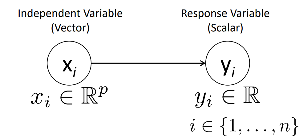 위 그림을 간단히 설명하자면 independent variable(vector) x는 p 차원의 실수 범위 안에 있는 변수이다. 이를 통해 실수 범위에 있는 y(response variable) 를 예측하는 것이다.